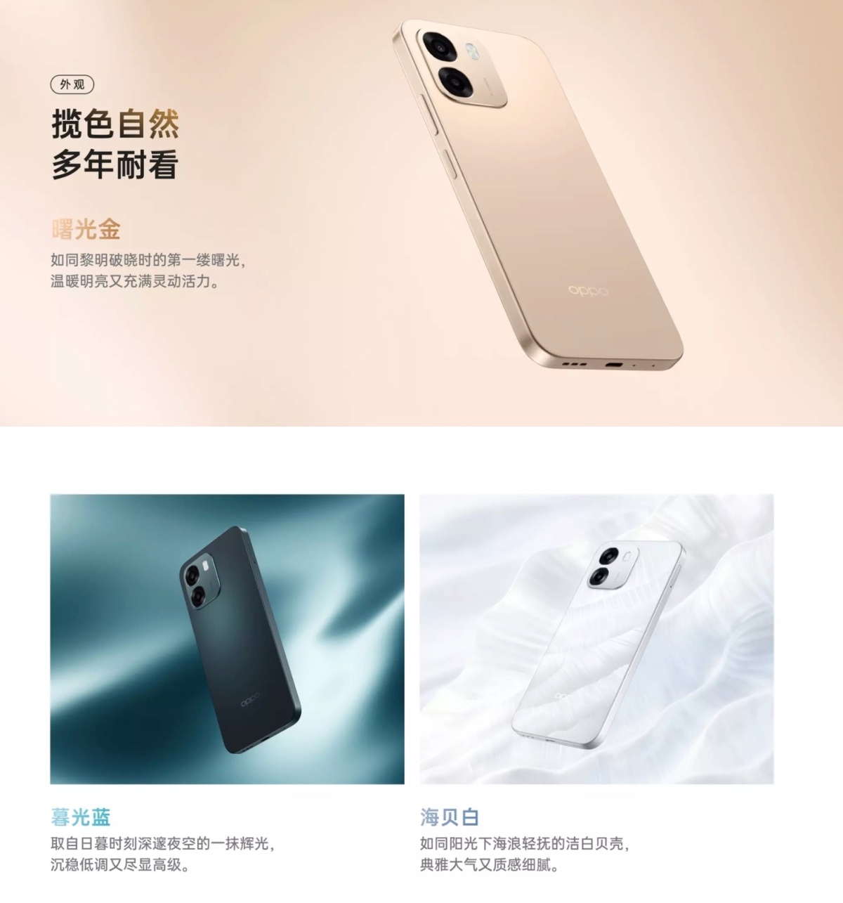 在显示方面,OPPO A6k采用6.75英寸LCD直面屏,分辨率为1570×720像素,支持60Hz、90Hz、120Hz智能刷新率切换,最高触控采样率达240Hz,滑动操作跟手流畅,最高亮度900尼特,全局激发亮度可达1125nits,在户外强光环境下依旧清晰可见,同时具备硬件级低蓝光防护,长时间使用更护眼,搭配1670万色显示与专业色域适配,兼顾观感舒适与使用健康,机身厚度约为8.61mm,重量约216g,握持手感扎实均衡,日常携带无明显负担,提供曙光金、暮光蓝、海贝白三款时尚配色,满足不同审美偏好。